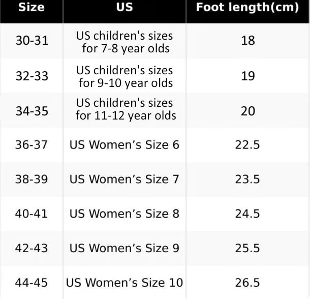 Note: Size is based on foot length and may vary slightly in actual measurements. We recommend buying one size larger.